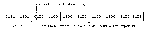 (1) Ponemos los primeros 8 bits de la mantisa en el segundo byte (sabemos que el primer bit es 1), los siguientes 8 bits en el tercer byte , los siguientes 8 en el cuarto byte y los ultimos 8 en el quinto byte.