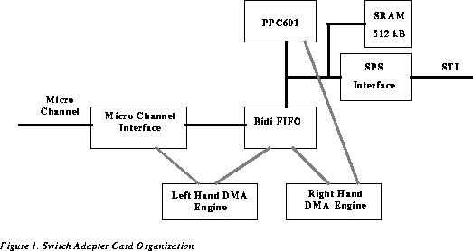 Cada nodo se conecta a la tarjeta microcanal utilizando un switch que permite detectar los errores en los mensajes. Esta tarjeta consta de diversas partes incluído un microprocesador PowerPC 601, como se observa en la figura :